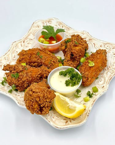 Served with Zesty Greens with Potatoes, Lemon, Garlic and Crushed Tomatoes over Rice with Chicken